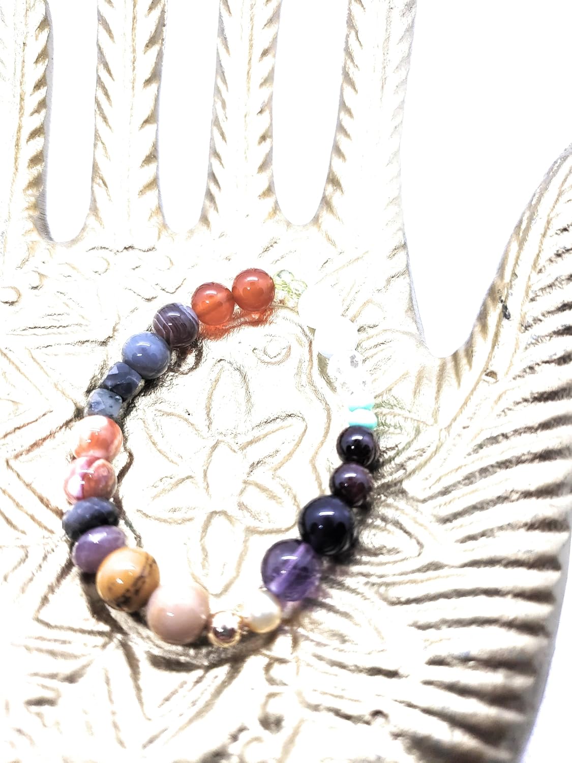 This is a double revelation crystal bracelet based on the Book of Revelations in the Bible Chapter 21. All the beads are natural crystals with each having a special meaning and protection for the person who wears the bracelet. Each one is one of a kind. It includes the name of each crystal and a special blessing from me. I hope you enjoy spending time with this special bracelet for many years to come. Starting with the gold-filled bead Jasper: Jasper provides courage, energy, and stamina to help you overcome any obstacles. Sapphire: Sapphire is a stone of wisdom that brings peace and joy into your life. It also helps with mental clarity and communication. Chalcedony: Chalcedony is a calming stone that promotes peace and emotional balance. It also helps with communication and self-expression. Emerald: Emerald is a stone of fertility that can also bring wealth and abundance. It also helps with mental clarity and communication. Sardonyx: Sardonyx is a stone of protection that can help you overcome fear and negativity. It also helps with self-confidence and assertiveness. Carnelian: Carnelian is a stone of motivation and creativity that can also bring good luck and prosperity. It also helps with motivation and creativity. Peridot: Peridot is a stone of vitality and renewal that can also bring peace and prosperity. It also helps with emotional balance and stress relief. Aquamarine: Aquamarine is a stone of clarity and communication that can also bring peace and prosperity. It also helps with emotional balance and stress relief. Topaz: A stone of Truth, Joy, and Happiness. Chyrsoprase: Shields against negative influences. Garnet: The Stone of Passion and Courage. Amethyst: Effective against addictions. Increases intuition and psychic powers. God is the Bread of Life. Who teaches us to love everyone. So we can live forever. Amen.