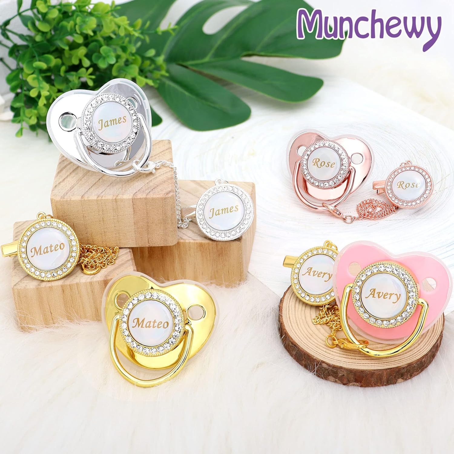 Personalized Pacifier and Pacifier Clip with Name, Bling Gold Pacifier Clip Set with Gift Box Greeting Card