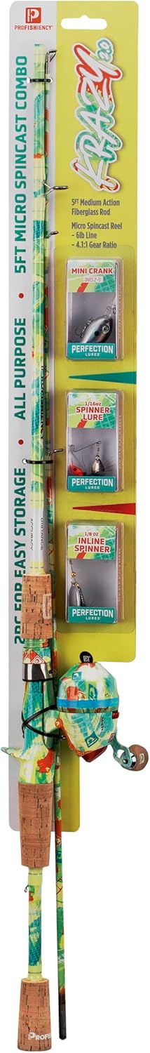 | Included Components | • Micro Spincast Reel w/ 4.1:1 Gear Ratio, •5’ Medium Light 2pc. Fiberglass Rod, •Aluminum Handle w/ Cork Knobs, •Cork Handle and Foregrip, •Pre-Spooled w/ 6lb Line |