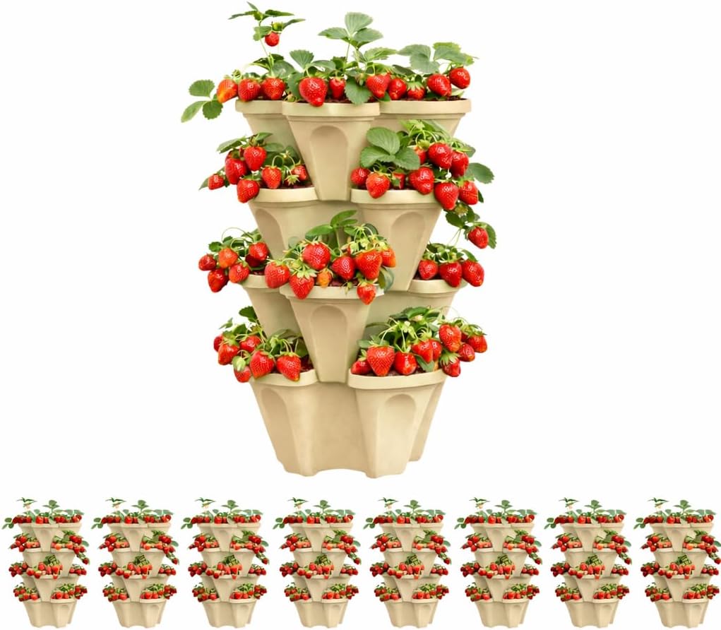 • Perfect Strawberry Planter Tower Designed for growing strawberries vertically, this stackable planter allows plants to cascade naturally while improving airflow, sunlight exposure, and overall yield.