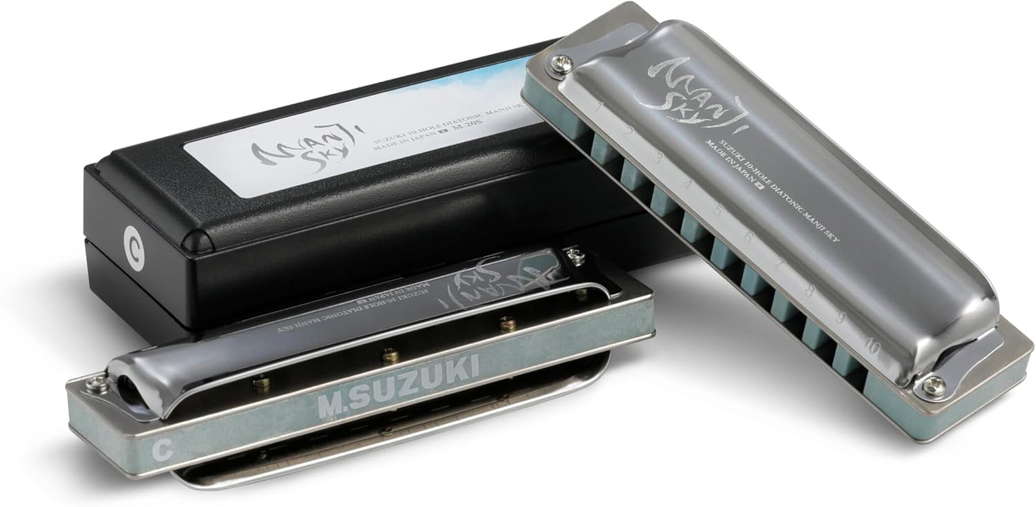 The lightest response and tone of all Suzuki 10-hole harmonicas. Utilizing an all-new exclusive reed design, Manji Sky boasts the lightest reed response of any Suzuki harmonica making It the perfect choice for quick note changes or “vamping” and easier bends! Manji Sky uses the same familiar cover design as Manji and the same composite body in a stunning Sky Blue finish. Choose Manji for Rock and Blues or Manji Sky when a lighter touch and tone is required.