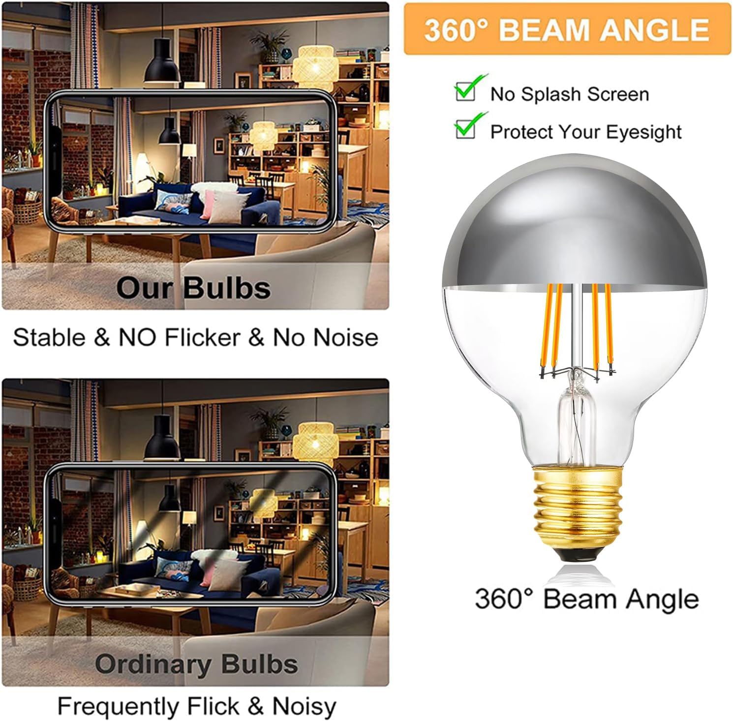 FIXTURE APPLIED - G25/G80 E26 Globe Light Bulbs extensively applied for wall sconces, indoor or outdoor. Typically used for home or commercial decoration. Kitchen, living room, bedroom, bar, coffee shop, restaurant,dining room light bulbs,vanity light bulb,candle bulbs,rustic decoration,wall fixture,accent light fixture,glass fixture,wall sconce,exit sign,indoor and outdoor fixtures.Features:✔ Dimmable:Smooth dimmable 0%-100%✔ No flicker✔ Instant On✔ Non buzzing or non humming✔ Globe bulb✔ Color Rendering Index (CRI) 90+SPECIFICATIONS :➤Wattage:6W➤Voltage: 120V AC➤Lumen output: 600LM➤Color temperature: 2700K➤Socket: E12➤Size: 4.25in*3.15in➤Package Included: 6 x 6W Half Chrome Globe Light BulbCautions :1. Easy to install, just 3sec to screw in the Edison bulb, the E26 base fitting for most light fixtures2. Switch off the power before replace the lamp.3. Keep away from direct sunshine and too high temperature.4. If any doubt about the installation or use of this product, please consult a competent electrician.5. If you are not 100% satisfied with your purchase or there is any damage in transit we will make it right. We are committed to responding to any request within 24 hours.